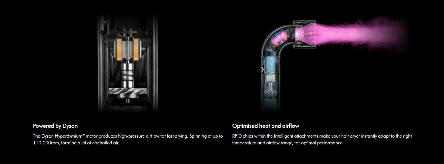 Dry and style every hair type with five intelligent styling attachments. RFID chips within the attachments remember the last used setting.